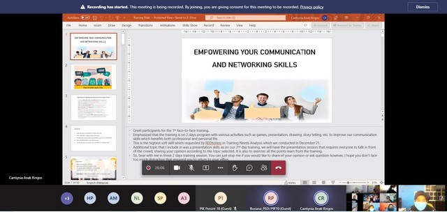 14 April 2022 | Aktiviti Terkini13 April 2022, Rabu – Pihak pengurusan Sprintz Designs Sdn. Bhd telah mengadakan Kursus secara atas talian bertajuk Kursus Memperkasa Komunikasi, Rangkaian dan Pembentangan untuk staf Pusat Ekonomi Digital (PEDI) daripada Putrajaya dan Linggi secara atas talian melalui applikasi Microsoft Team. Kursus ini telah dihadiri oleh 9 staf iaitu pengurus dan penolong pengurus dari Pusat Ekonomi Digital (PEDI) Presint 9 Fasa 3, Presint 9 Fasa 10, Presint 16, Presint 18 dan Linggi.