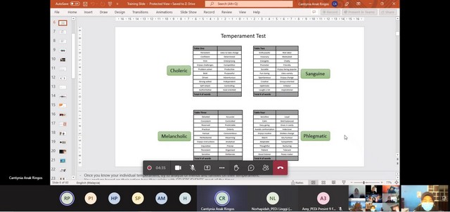 Semasa sesi kursus berlangsung staf-staf PEDi melakukan ujian Memahami Personaliti Melalui Perangai dan berbincang bersama impak ujian ini dalam komunikasi Kursus ini telah diadakan sebanyak dua sesi sehari, sesi pertama bermula pada pukul 10:00 pagi sehingga 12:00 tengah hari dan sesi kedua 2:00 sehingga 4:00 petang..